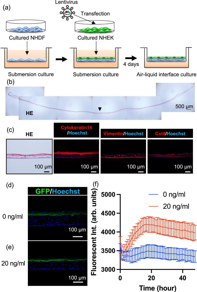 The researchers genetically engineered human epidermal keratinocyte stem cells (KSCs) — which naturally possess high sensitivity and selectivity to environmental stimuli — to express enhanced green fluorescent protein (EGFP) in response to specific biomarker signals.