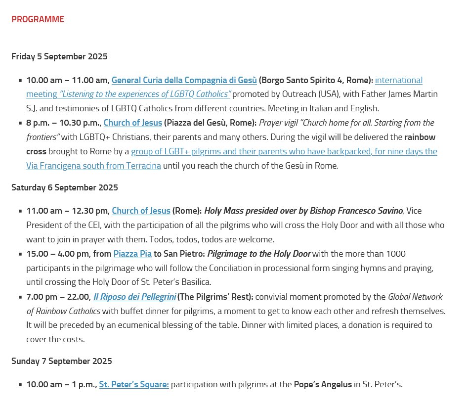That evening, a prayer vigil at Rome’s Gesu Church, themed “Church – a home for all. Starting from the borders,” includes LGBTQ+ Christians and their families. A rainbow cross, carried by pilgrims along the Via Francigena, is presented. On September 6, Bishop Francesco Savino leads a Mass at Gesu Church, followed by a Jubilee Pilgrimage to St. Peter’s Basilica’s Holy Door with over 1,000 participants.