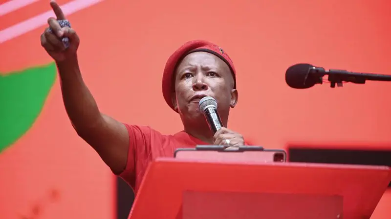 Julius Malema, leader of South Africa's Economic Freedom Fighters (EFF), is awaiting sentencing for firing a rifle at a rally in 2018. Thousands of supporters gathered outside the court, displaying placards in his favor.
