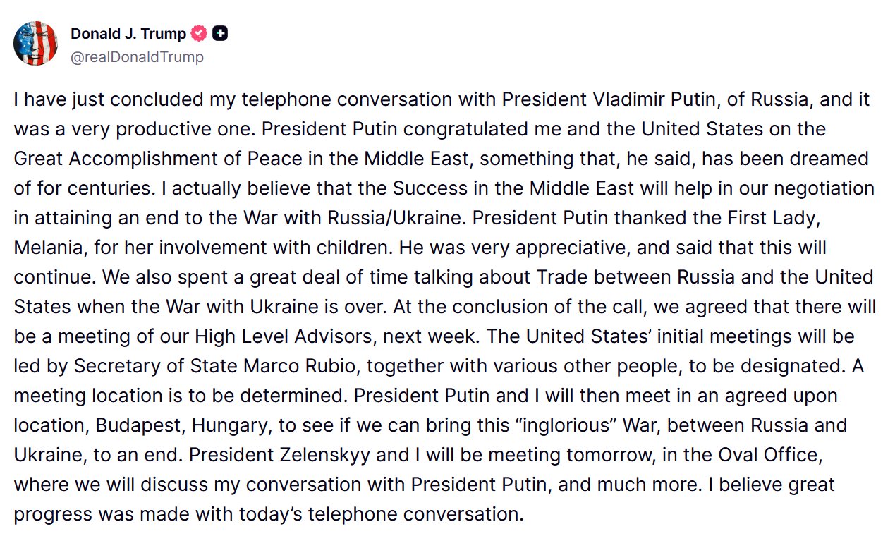 President Trump and Russian President Putin agreed to meet in Budapest to discuss ending the war in Ukraine. Trump stated he believes the recent Gaza peace deal could aid negotiations. The call lasted over two hours before Trump meets Ukrainian President Zelenskyy.
